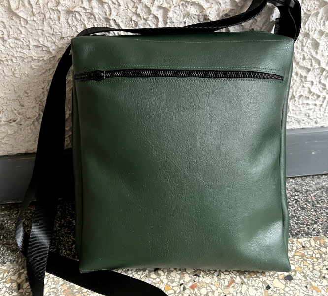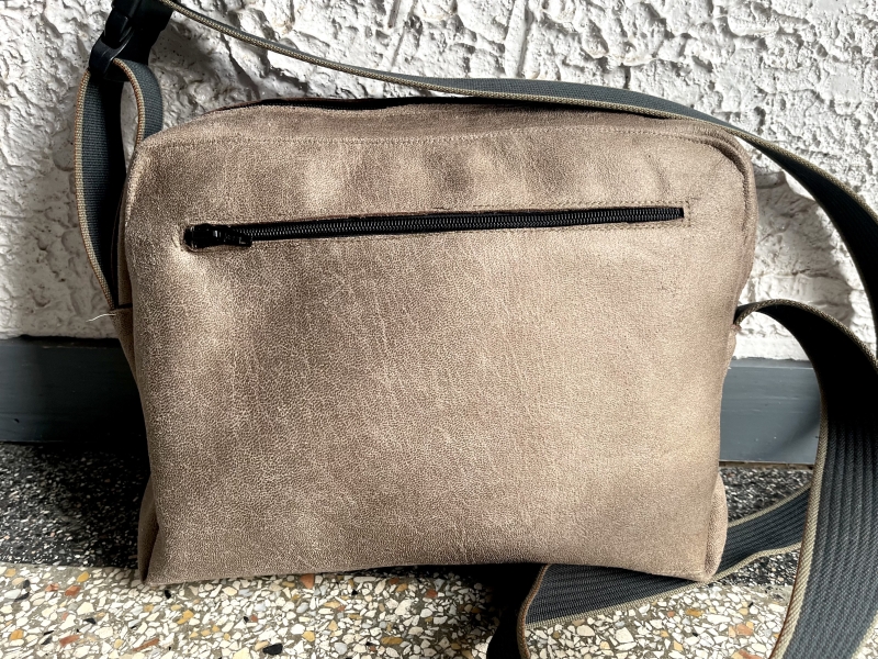 Met extra vak achterop die dicht gaat met rits en 1 groot vak in het midden