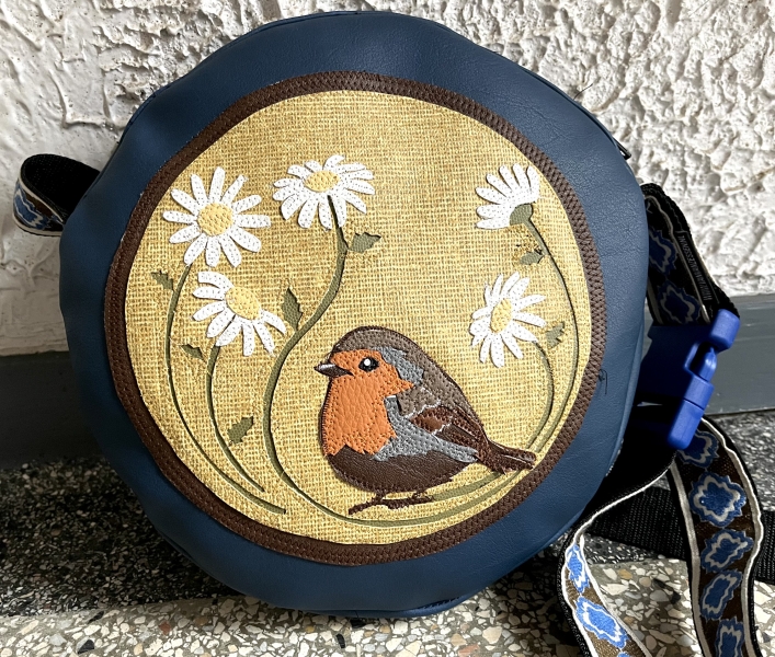 Handgemaakte donkerblauwe roodborstje met madeliefjes ronde schoudertas