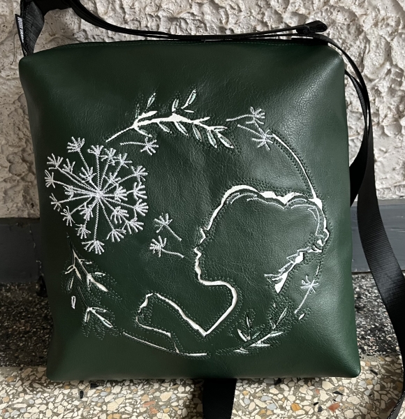 Handgemaakte donkergroene vrouw die paardebloemen blaast vierkante schoudertas