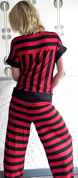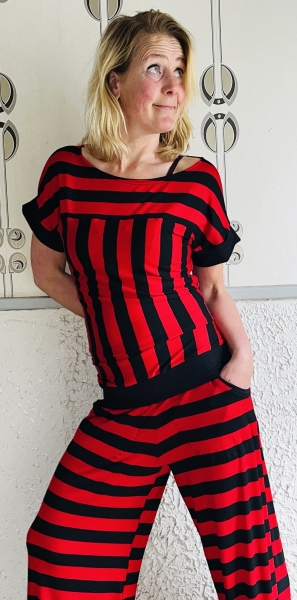 Handgemaakte zwart rode strepen shirt met boothals