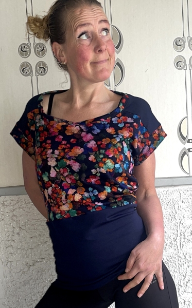 Handgemaakte overslagblouse de kraag kan je hoger en lager dragen.